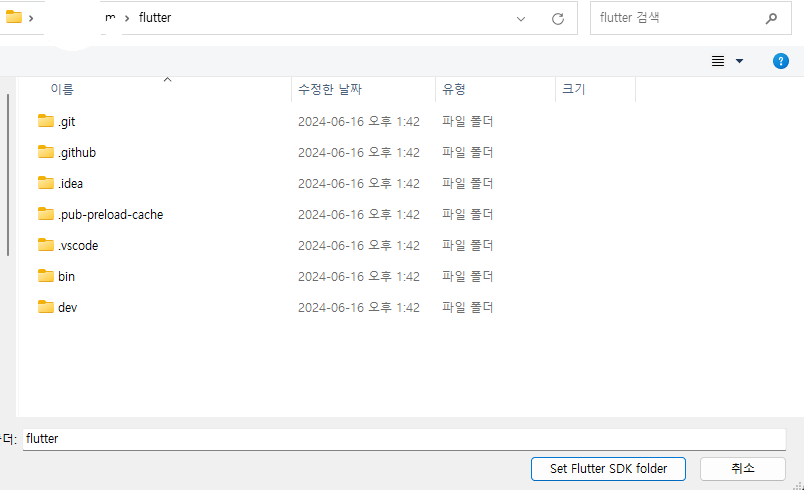 2. 압축 해제한 폴더안 Flutter 폴더를 특수문자, 한글 등이 포함되지 않은 폴더에 넣는다.