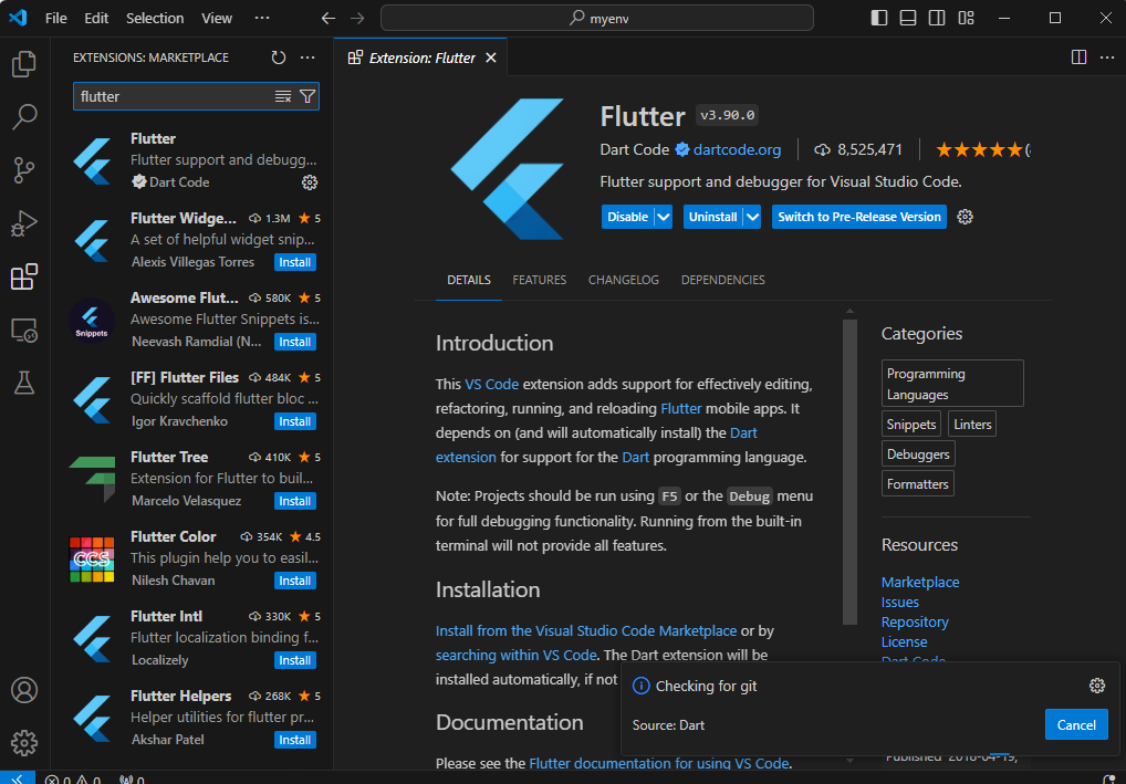 2. Extension Tab에서 Flutter를 검색 후 설치해준다.
