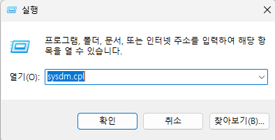 1. Windows + R을 눌려 sysdm.cpl을 입력 후 실행