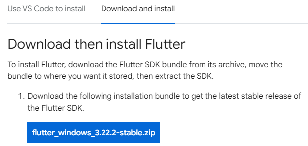 1. Flutter 공식 홈페이지에서 flutter SDK 압축파일을 다운로드한다.