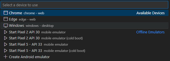 에뮬레이터가 깔려 있다면 Chrome, Edge, Window 밑에 mobile emulator를 선택할 수 있다.